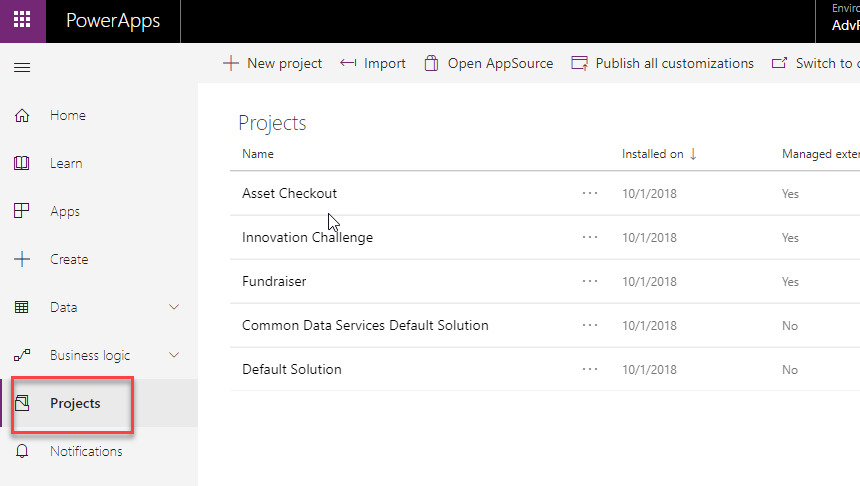 With the latest preview release of the PowerApps portal (check your preview environment, more here) you might happen to notice the link that normally says "Solutions" has been renamed to "Projects". This is nothing more than a label change for now. All the other screens and tools will still say Solutions.
