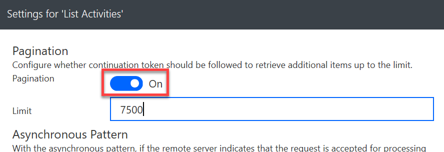 On the Settings panel, you will find the Pagination setting along with a limit. By default, Pagination is off.